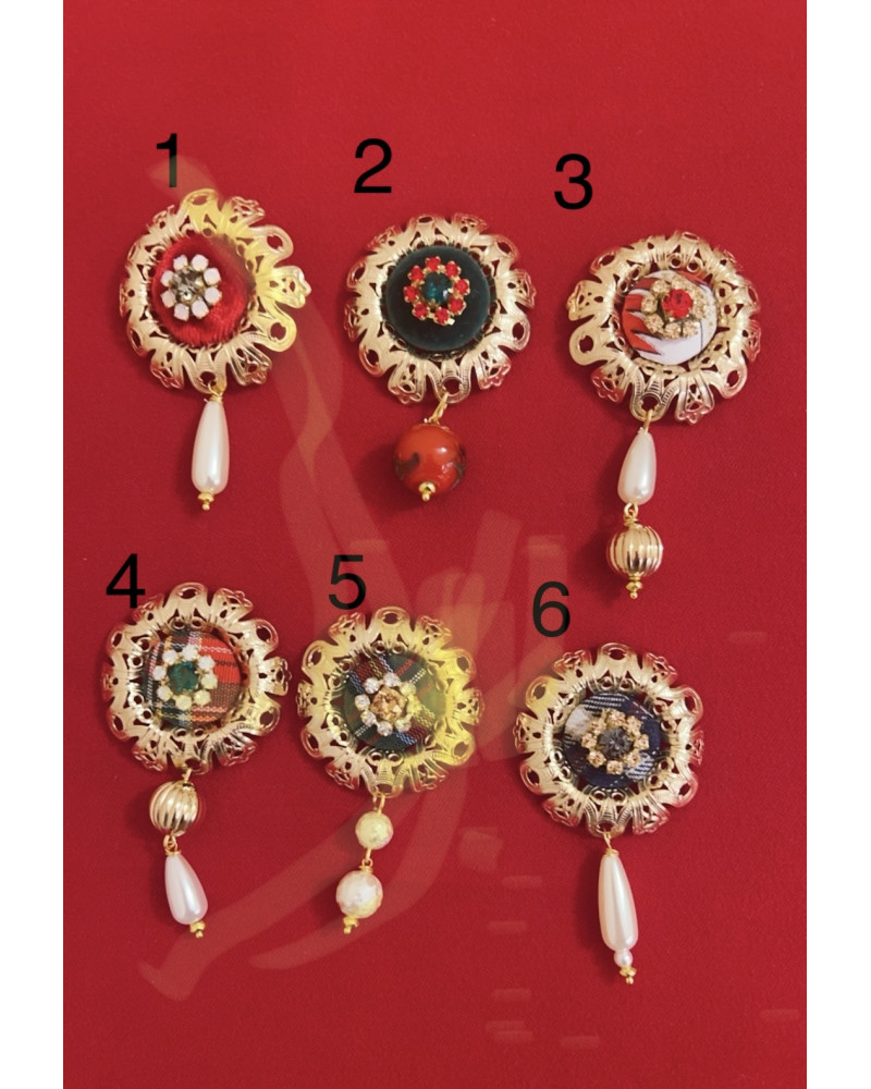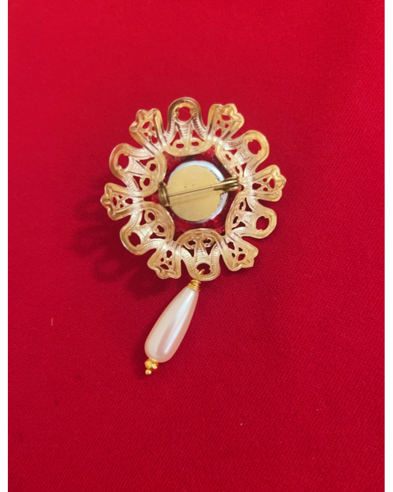 Spilla creata artigianalmente nel nostro negozio, con filigrana bombata in galvanica oro, bottoncino strassato e pendente