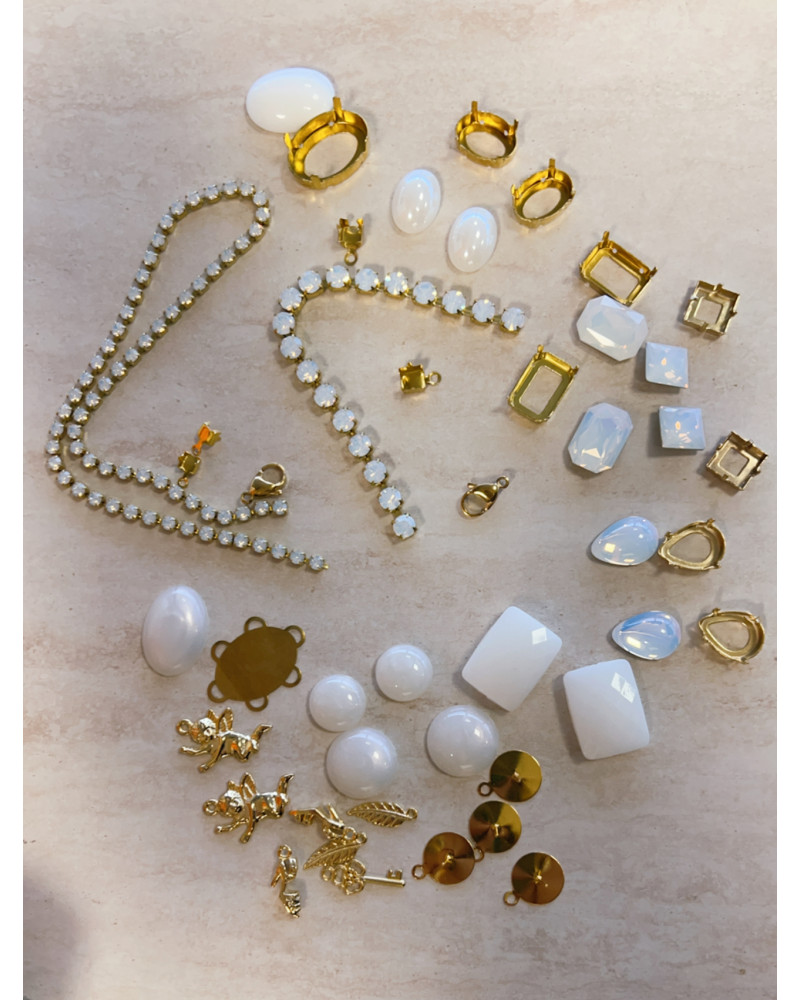 Box con vari elementi anche per realizzare progetti ad uncinetto, contenente castoni, cristalli, strass ed elementi come in foto, per creare parure ispirata al colore Pantone dell’anno 2026 Could Dancer